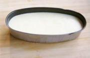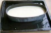 烤盘内倒入清水放入烤箱中下层,将奶酪模放入装有水的烤盘中,烤约1小时(在烤制30分钟后可在烤盘中再加入些凉水防止蛋糕表面开裂)。