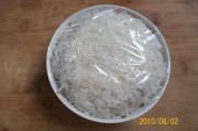 取出蒸好的八宝年糕饭,除去保鲜膜;