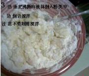 迅速把沸腾的液体倒入粉类中,边倒边搅拌,注意不要划圈搅拌。