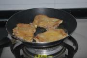 平底锅倒入少许油,烧热后放入腌好的鸡腿肉,鸡皮朝下放入,煎的时候用铲子不断的在肉身上压,待鸡皮煎至金黄翻面,用同样的方法煎另一面。