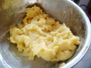关火,将烫熟的面装入干净盆中,趁面的余温还在,打入一枚鸡蛋,并用手将鸡蛋揉入面粉。