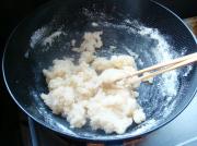 再打入一枚鸡蛋,同样操作,是鸡蛋和熟面充分融合为一体。