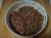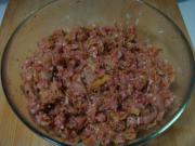 将淹制好的肉馅,一分为二,放水材料水,顺一方向搅拌.放入葱姜芹菜,继续顺一方向搅拌均匀,即可.