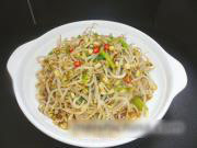 “1自己泡的绿豆芽洗净。2热水焯烫后晾凉。3锅内热油,倒入花椒、尖椒、盐、葱,炝出香味关火。4加生抽、香油、醋,倒入豆芽拌匀即可。”