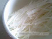 白萝卜洗净去皮后切丝,加入少许盐腌一下,目的在于让萝卜里的水份排出一些方便入味。待萝卜丝出水后,挤干水份,再加入适量的盐和糖备用(先不拌开)