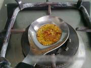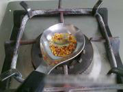 小勺里倒入少许油和干辣椒,煤气开到最小火,慢慢加热(我是图方便,当然用锅也行)