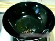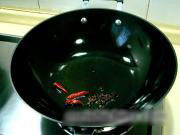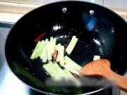 辣椒稍微变色后把腌制好的笋条滗净刹出的水分倒入锅中。