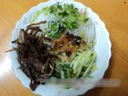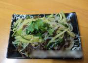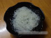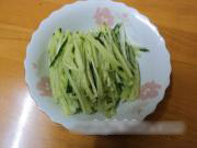 将青瓜丝、粉丝、木耳丝以及叮好的蒜苗都放入一大碗中,喜欢的可以加些香菜,浇上白醋、生抽、放适量盐和麻油,拌匀后可以装盘。