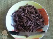把煮好的猪心放凉后,用手顺着猪心的纹理撕成长条状,可以用牙签帮忙