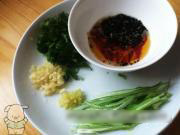 干红椒用剪刀剪成细丝加黑芝麻放在小碗里,倒入热油炸熟,葱切成细长丝,姜、蒜、香菜切末备用