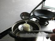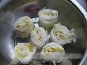 把白菜墩儿放在漏勺里,然后用勺子在上面浇热水,反复浇三四次,千万不要把白菜放水里煮,那样的白菜就没有嚼劲了