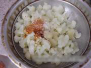 过了水的菜花内放入盐,味精,鸡精,蒜末,生抽,糖,最后放入辣椒面,