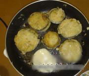 茄子切开 不要太厚 两片茄夹中间不要切断 可以夹东西的程度 然后 肉馅放入 蘸面糊小火煎,平底锅,油不能少。