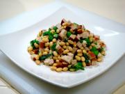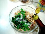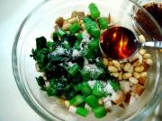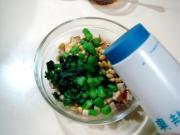 把食材汆烫煮熟后过凉,芥兰切丁同香干和煮黄豆一同放入碗中,里面放入盐。