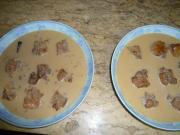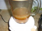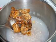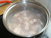 煮好后就变成排骨肉皮浓汤了,然后把排骨摆盘,肉皮汤放进料理机里打细,再放锅里煮开,放少许鸡精调味,撇掉泡沫和多余的油。
