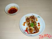 蒜头拍一下剁蒜米,葱切葱花放进小碗里,酱油、陈醋、油辣子各少许拌匀,然后淋到排骨冻上就可以上桌开动了^_^。
