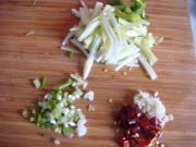 芹菜切段,葱切花,蒜剁泥,辣椒剪圈。