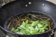 锅中倒入半锅水,加两勺盐,煮沸后将海茸与西芹下入抄3-5分钟至熟,捞起滤水。