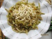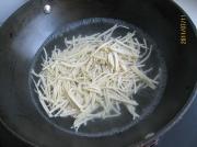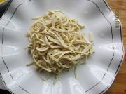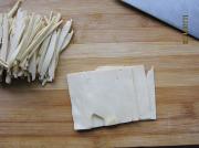 将豆腐干横片三片,切成细丝。
