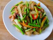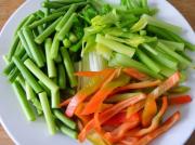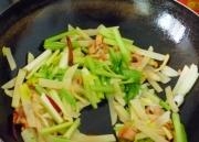 蒜薹、芹菜切换寸段、尖椒切成和蒜薹一样宽的粗条、香肠切成粗丝。