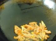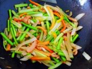 翻炒几下在放入蒜薹翻炒,蒜薹断生后放入盐、少许糖和味精,淋少许醋和香油出锅即可。
