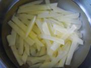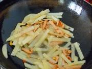 土豆切成比蒜薹稍宽一点的片泡入水中备用。
