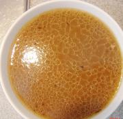 待汤汁完全凝固后,把上面的油刮掉不要,然后把下面凝结的部分从碗里倒出来,这是美容的哦,胶原蛋白呢。