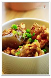 把海带在另一个碗里用一点盐拌一下,然后铺在猪蹄上面。