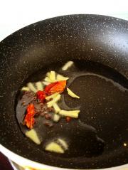 热锅凉油,加入姜丝,辣椒,花椒,炒香。
