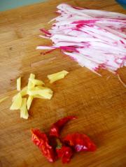 萝卜洗净切成丝状,切好后放入干净的容易里冰镇一会儿;姜切丝;辣椒切小段备用。