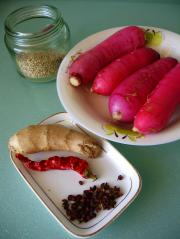原料:小萝卜,姜,干辣椒,花椒,芝麻。