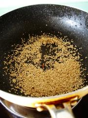 生芝麻炒熟,一次可以多做一些,炒熟的芝麻可以放干净的密封容器里保存,吃的时候随时可取,方便一些。