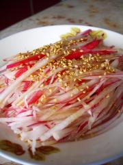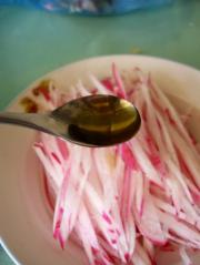 冰镇过的萝卜如果有水,就把水分倒出来。弄好的萝卜丝放入盘里,淋入花椒油。