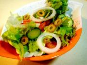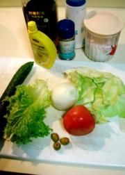 花叶生50克、洋葱20克、番茄1个、黄瓜50克、绿甘蓝2片、黑橄榄3粒,盐、砂糖、胡椒粉、橄榄油各适量,柠檬汁数滴。