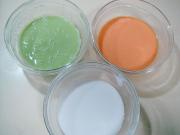 两只碗里的淀粉分别用油菜汁和甜椒汁澥开成浆,另一份淀粉用清水澥开,水份和淀粉的比例为二比一即可,然后静置30分钟。