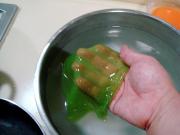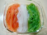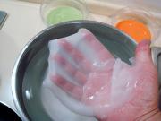 把无色的、绿色的和粉色的粉皮逐一制作完成后,用清水再把粉皮清洗一遍,使其彻底凉透。
