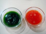 先把红甜椒和油菜叶切碎,分别用料理机搅打成浆,然后滤掉渣子备用。