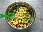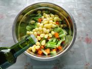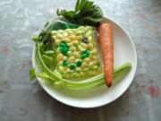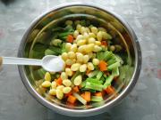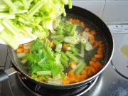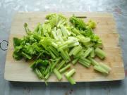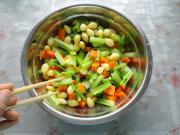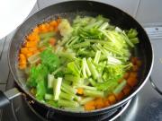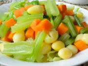 把胡萝卜丁和芹菜段一起继续焯烫一会儿,然后捞出放到凉水中过凉。