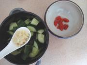 黄瓜切小块,蒜剁泥,枸杞泡发洗净待用。