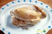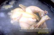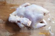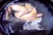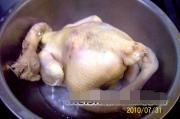 第二次冷热处理:待鸡冷却后,再一次投入开水中烫制4分钟左右(视鸡大小而定),然后,取出投入冷水中冷却(冷水要多,或用自来水冲凉)。