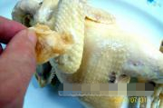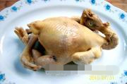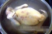第三次冷热处理:待鸡冷却后,最好一次投入开水中,烫制4分钟左右后(视鸡大小而定),离火焖2分钟左右,然后,取出投入冷开水中冷却(冷开水要准备多些)。