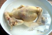 第一次冷热处理:用大锅将水烧开(最好能淹没童子鸡),将整只鸡投入开水中烫制4分钟左右(视鸡大小而定),然后,取出投入冷水中冷却(冷水要多,或用自来水冲凉)。
