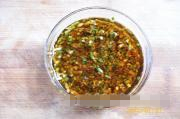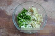 《葱姜一品汁》配制: 葱花姜末中,加入味精、白糖、生抽、高汤和适量香醋调味。
