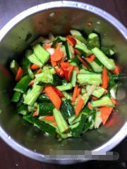 小黃瓜胡蘿蔔洗淨,用刀拍碎後切小斷,姜蒜洗淨備用