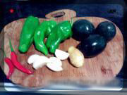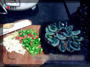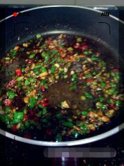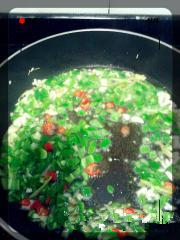 大蒜香味出来了 倒入以上青椒丁炒香。