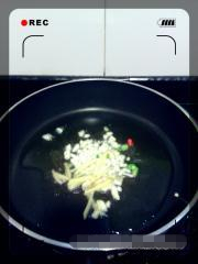 锅里倒油,用小火把大蒜、姜、煎香,我觉得大蒜只有用小火煎才会特别香。