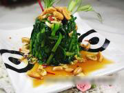 把料汁浇在菠菜墩上,撒上麻辣花生即可。