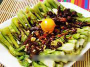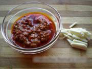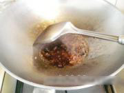 油热蒜瓣下锅炒香,加入牛肉酱爆锅,放适量的糖