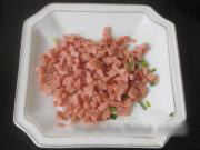 用一个小碗,放入搅拌好的火腿肠菠菜,压紧,倒在大盘里