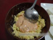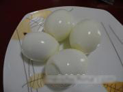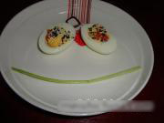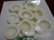 “1蛋煮熟,剥壳2把蛋黄挖出来3蛋黄加千酱捣成蛋黄泥4用裱花袋挤到蛋白里,加点西红柿,黑白芝麻那可”
